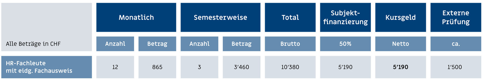 Im Kurs­geld sind Unter­richt, Lehr­mittel, Lern­platt­form, Fall­studien­korrekturen und Simulations­prüfungen schriftlich und mündlich ent­halten. Nicht enthalten sind persönliche Auslagen bei all­fälligen Work­shops und Seminaren für Ver­pflegung. Externe Prüfungs­gebühren werden direkt an die Prüfungs­kommission bezahlt. Die Prüfungs­gebühren können von Jahr zu Jahr ändern (Stand: 01.05.2020). Preis­änderungen bleiben vor­behalten.